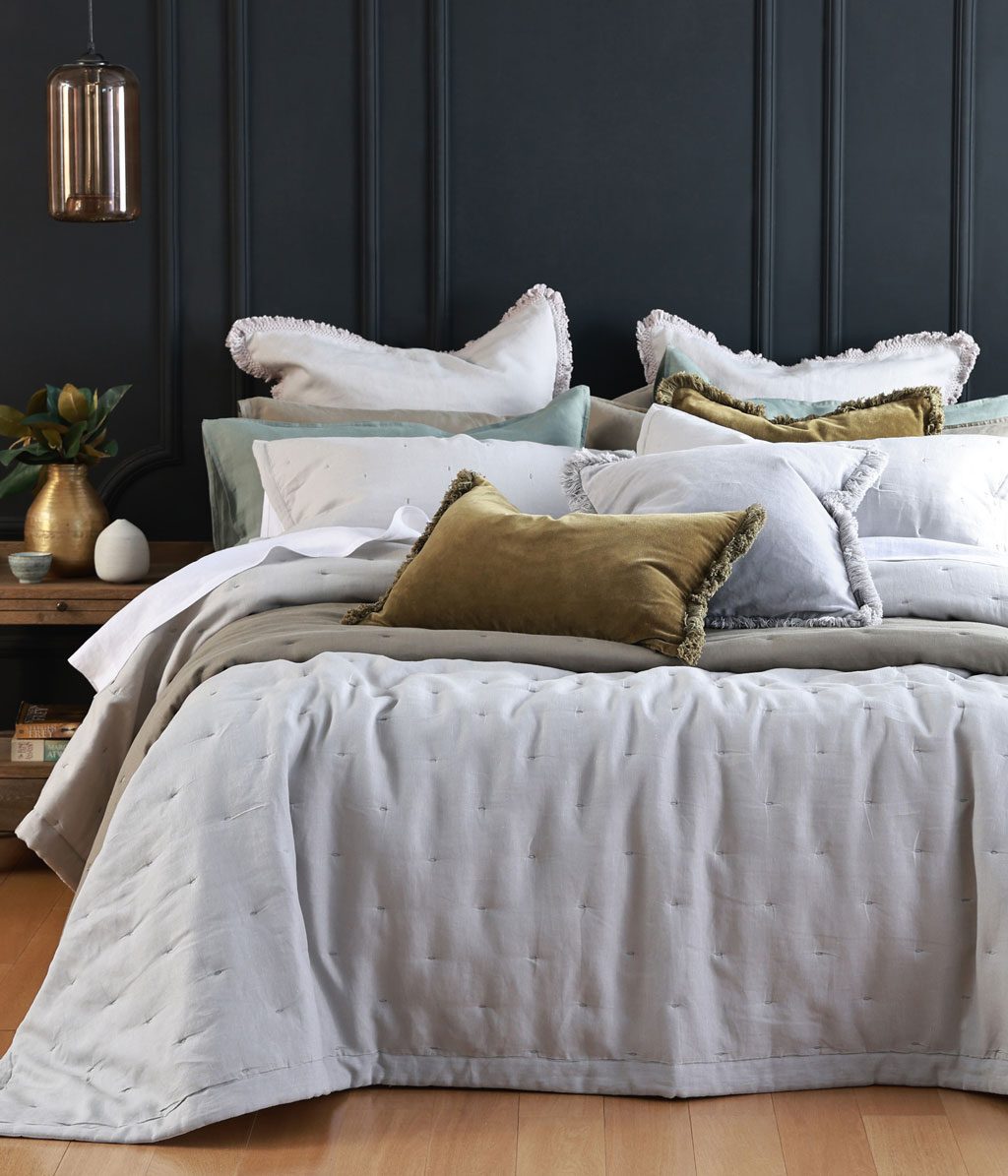 100% Pure Linen Bedspread Set that has been pre-washed for softness, with a white cotton reverse and pintuck embroidery.100% Pure Linen Bedspread Set that has been pre-washed for softness, with a white cotton reverse and pintuck embroidery. Available in a range of colours. Available in a range of colours.